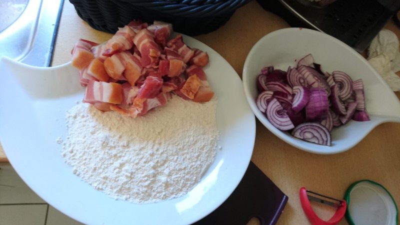 Dann mit Gurke, Speck und Zwiebeln füllen